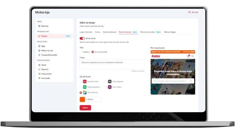 Com esse recurso, agora é possível exibir uma mensagem em destaque no topo da loja personalizada, de forma totalmente visível para quem acessa o seu espaço.
