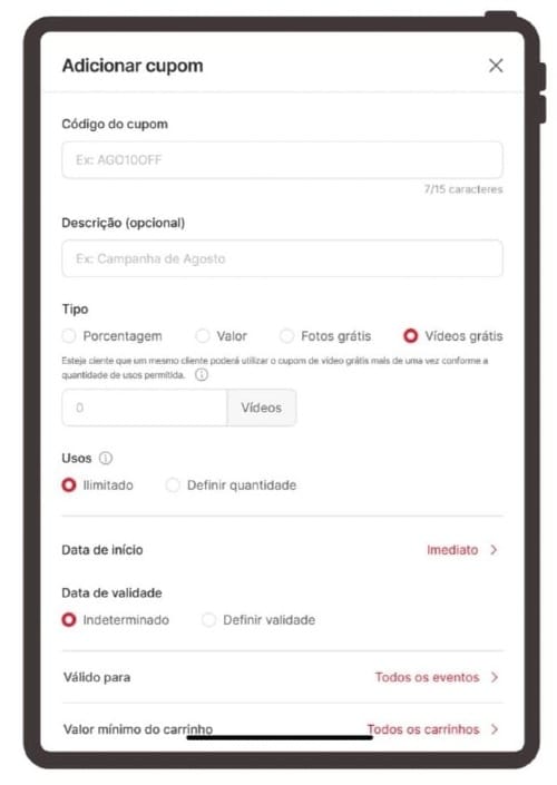 Com essa funcionalidade, é possível configurar o cupom de forma segmentada, definindo quais vídeos estarão disponíveis gratuitamente, o período de validade e o público que poderá utilizá-lo.