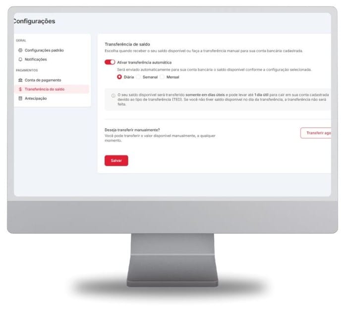 Nessa opção, o fotógrafo pode desligar a transferência automática e escolher exatamente quando deseja realizar a retirada dos valores — a qualquer hora, em qualquer dia.