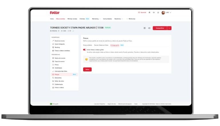 Para viabilizar o modelo, a empresa estabeleceu apenas um critério: o fotógrafo precisa atingir 500 fotos ou vídeos vendidos em um período de 90 dias. Ao cumprir esse requisito, a Entrega Grátis fica disponível para ser ativada em qualquer evento, recente ou antigo.